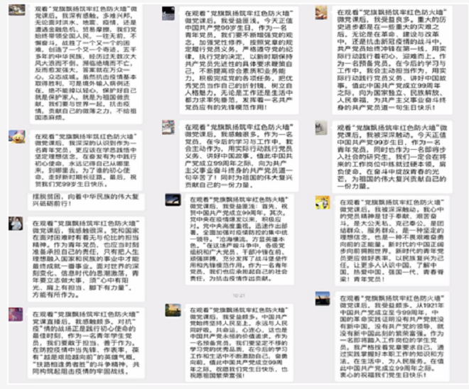 “讲述战疫故事,传播抗疫精神,激发责任担当”,“以支部为单位,说身边故事,谈切身体会,形成具有高校特色的‘战疫故事会’”,“精选高校师生党员战疫事迹、案例,建立内容丰富的党性教育资源库”,……这堂涵盖面广、内容丰富的微党课使观看人员深切感受到,党组织、党员在共战疫情中先行的责任。通过那一个个鲜活的抗疫故事,体现了党员们以旺盛的斗争精神、昂扬的奋斗姿态、优异的工作成绩,让党旗始终高高飘扬在疫情防控、返校复学、事业发展全过程全方位。