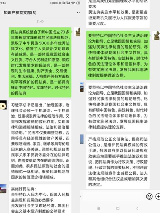 “今天中国的民法典可以说是21世纪互联网、高科技时代民法典的代表。在实务中的劳动用工问题与《民法典》有千丝万缕的联系,我们要结合自己的专业,多思考多研究。”劳动社会保障法教研室谢德成老师说。同学们在线上也展开了积极的讨论交流和观看心得,2017级马瑜佳同学激动地说:“观看后,民法典的形象突然从单纯的文字变得立体、鲜活、有人情味起来。法学家们是怀着人民至上的价值追求来编纂民法典的,作为一名法学生要怀着平民情怀来学习它理解它,才能真正领会民法典的意义。”