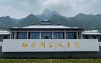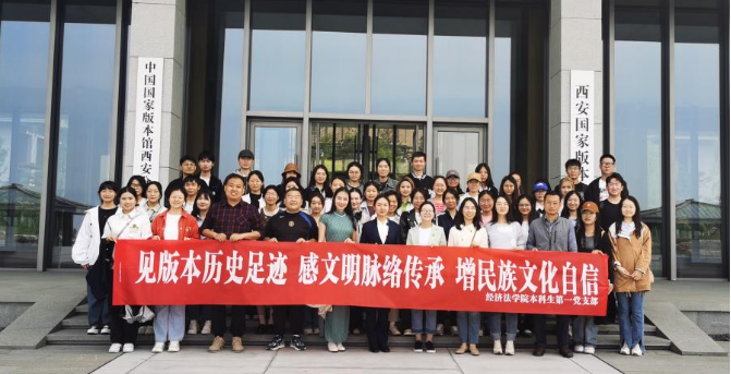 师生们拾级而上,登上文济阁,版本馆全貌尽收眼底,中轴对称式布局体现出北方园林的庄严肃穆之感;踏入保藏中心序厅,一排长90米、高20米的四层巨型通顶书墙映入眼帘,寓意守护的天禄和麒麟雕塑摆放在两侧,书墙陈放着上万册不同时期不同版本的卷轴、线装书籍、古籍,充分展现西安国家版本馆浓郁厚重的文化底蕴。在了解到西安国家版本馆作为中国国家版本馆“一总三分”的分馆之一,将带有中华文明印记的各类版本纳入其中,着力打造独具特色的中华版本资源集聚中心、西部区域中心和地方特色版本中心,承担中华版本保藏、展示、研究与交流功能等情况后,党支部师生党员们对以习近平同志为核心的党中央积极推进文化安全顶层设计的重要战略举措由衷赞叹。