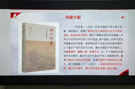 读书分享会的最后,卢晴同学总结了对于《初心往事:一百个党史故事》一书的深刻感悟,号召同学们在工作生活中学习前辈的优秀品质,树立坚定不移、勇担使命的信念,弘扬爱国主义精神,做听党话、跟党走、理想信念坚定、勇于担当的新时代青年。(供稿:张兴浩)