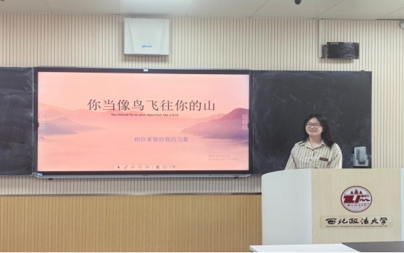 最后,苏林祺同学为同学们分享了《你当像鸟飞往你的山》这本书,旨在让同学们相信重塑自我的力量。重塑自我,最重要的是思想的改变。但即使是思想觉醒,想和做是两码事。要有十足的信心和坚定的信念。她分享道“我们生命中都有一座真正的山属于我们自己。希望我们每个人最终都能够像鸟一样,飞往我们自己的山。”
