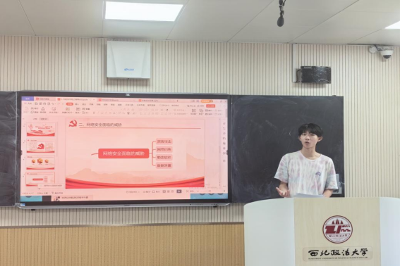 随后,顾英民同学以“校风学风之网络安全”为主题,从“网络安全重要性”、“面临的威胁”以及“如何应对网络安全问题”三方面进行了详细介绍,使同学们明晰了文明上网的重要性,增强了网络安全防范,做到自律自控不沉迷网络。