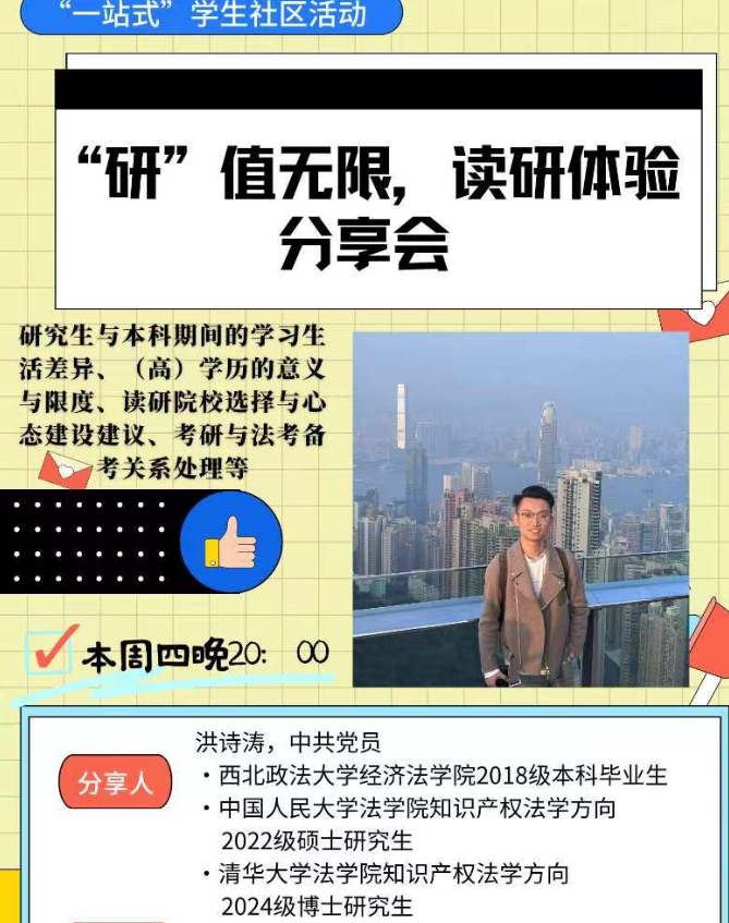 5月23日晚上,本科生第二党支部采用线上方式组织开展了一场别开生面的法学读研分享会。本次分享会邀请了成人直播2018级本科生,2022年推免至中国人民大学,现在清华大学攻读法学博士学位的洪诗涛同学分享读研体验,近百名在校本科生参加。
