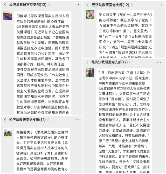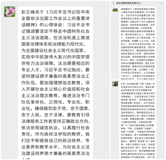 校的教师,我们要胸怀“两个大局”,找准人生定位与奋斗目标,始终坚持中国特色社会主义法治道路。将社会主义法治的价值理念渗透进法学专业课程,将社会主义核心价值观融入教学过程中,以公平正义树立行为规则,在提高学生的法学知识水平的同时,培养学生的思想道德素养。郑艳馨同志认为:作为法学专业老师,首先要用思想利器武装自身,提升科学的理论水平,塑造高尚的价值观,温润丰富的内心世界,涵养优秀的意志品质,将思政教育融于法学教学之中。同时,在讲解专业课程时,对政治问题要讲明规则、摆正方向、框定跑道,要把对学生的德育观塑造放在重中之重,以正确的“三观”打开学生们笃学尚行、止于至善的人生大门,从而真正为社会输送大量的政治坚定、专业过硬的法学专业人才。彭立峰同志认为:习近平总书记强调要坚定不移走中国特色社会主义法治道路,在法治轨道上推进国家治理体系和治理能力现代化,为全面建设社会主义现代化国家、实现中华民族伟大复兴的中国梦提供有力法治保障。倪楠同志认为:中国特色社会主义政治制度具有独特的优势和功效。为党和国家兴旺发达、长治久安提供了有力政治保证和制度保障的中国特色社会主义政治制度,在推动中国特色社会主义事业发展的历史进程中展现了并将继续展现出显著的政治优势和巨大的制度功效。李军波同志认为:习近平总书记在中央全面依法治国工作会议上的讲话突出了依据宪法保护公民的基本权利的重要性。没有人民权益的切实维护,依法治国就背离了根本。人民的权利权益既是社会主义法治的出发点,也是社会主义法治的重要着力点。孙文凤同志认为:作为一名法学高校的研究生,在社会主义法律体系的不断完善过程中,在全民法治意识的不断提升中,维护宪法法律权威,学习相关法律,汲取中华法律文化精华、围绕具有中国特色的法治理论展开学习,提升自身的法治意识,为实现国家治理体系、治理能力现代化贡献自身的力量。