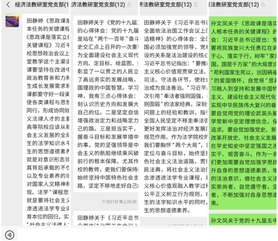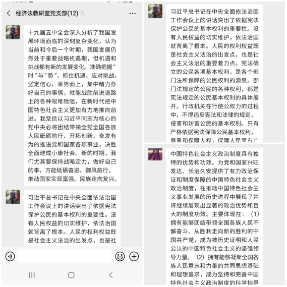 此次线上主题党日活动,经济法教研室党支部主要集中讨论学习了习近平总书记在中央全面依法治国工作会议上的重要讲话,会上大家畅谈了对习近平法治思想的心得体会。田静婷同志认为:习近平总书记多次引用“奉法者强则国强,奉法者弱则国弱”的法家经典,深刻分析法治问题上的经验和教训,指引全党和全国人民坚定不移走奉法强国之路,更好发挥法治对经济发展的引领和规范作用。作为法成人直播
