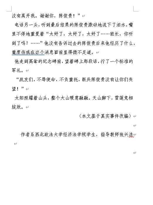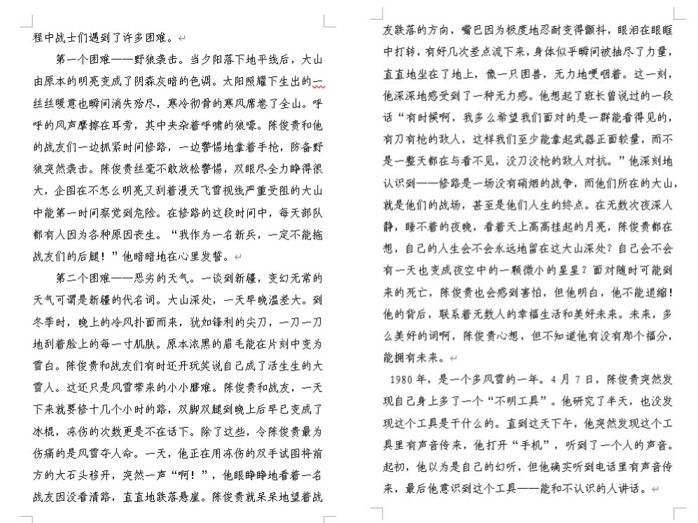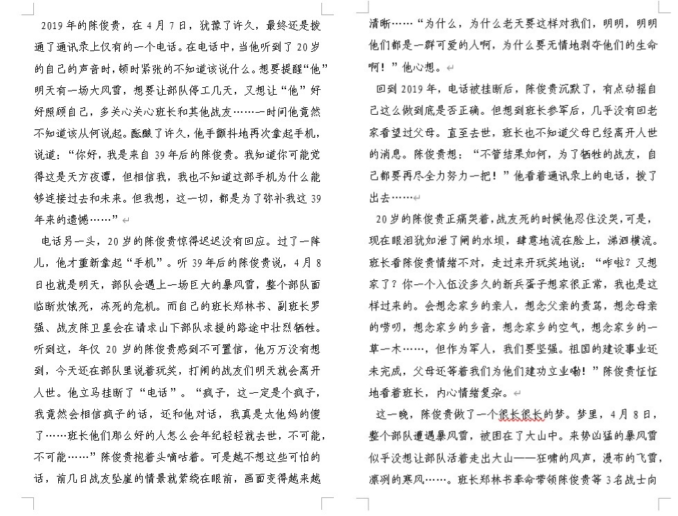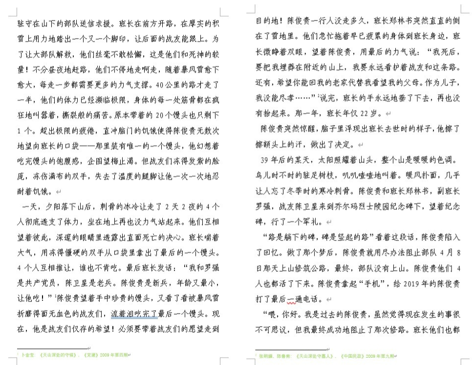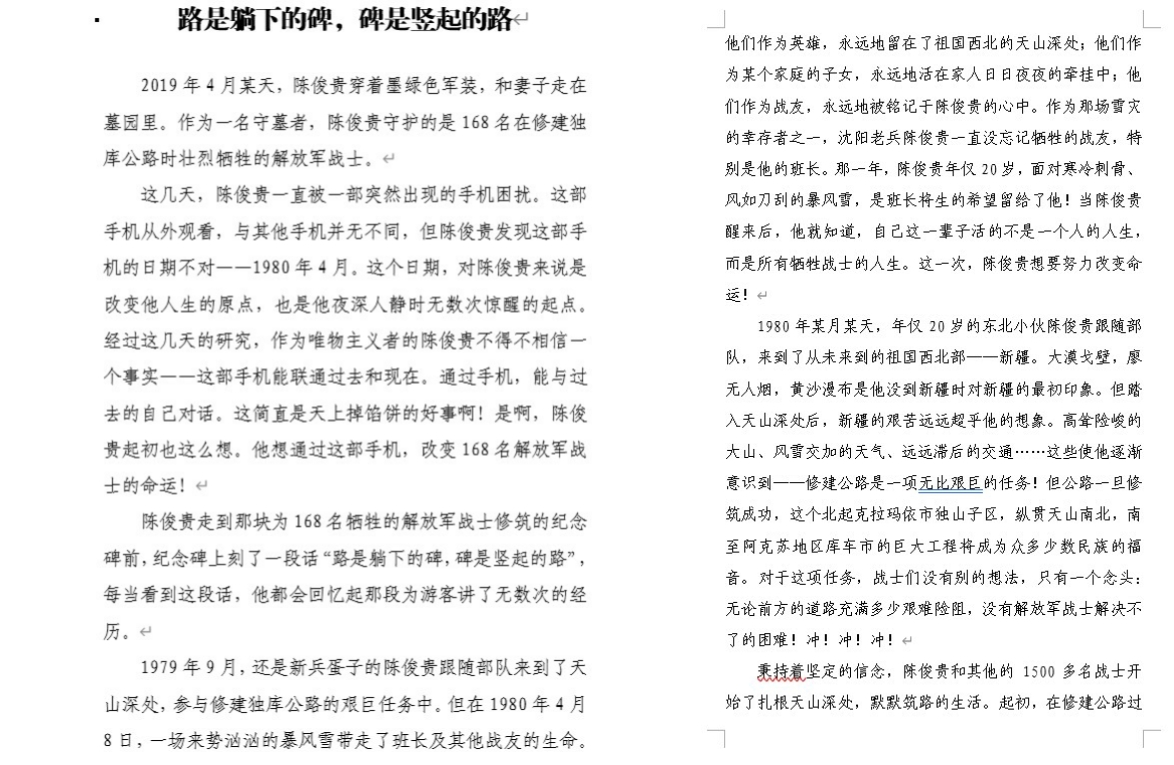 杨天婉同学以为建设新疆独库公路作出重大贡献的优秀党员陈俊贵同志为原型,用生动的语言描绘出了陈俊贵和他的战友们不惧危险,冒着风雪修筑独库公路的场景。为我们展现出了面对生死,国家利益高于个人利益的崇高信念。“路是躺下的碑,碑是竖起的路”,独库公路不仅是一条横穿天山山脉,连接南北疆的公路,更是一座承载着168名士兵信念的丰碑。