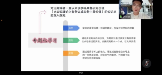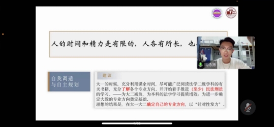 现就读于中国人民大学的洪诗涛进行了自我学习经验的交流与学习规划,他认为每个人对于未来攻读方向的决定至关重要,并且鼓励我们提早对各部门法进行钻研和探索。