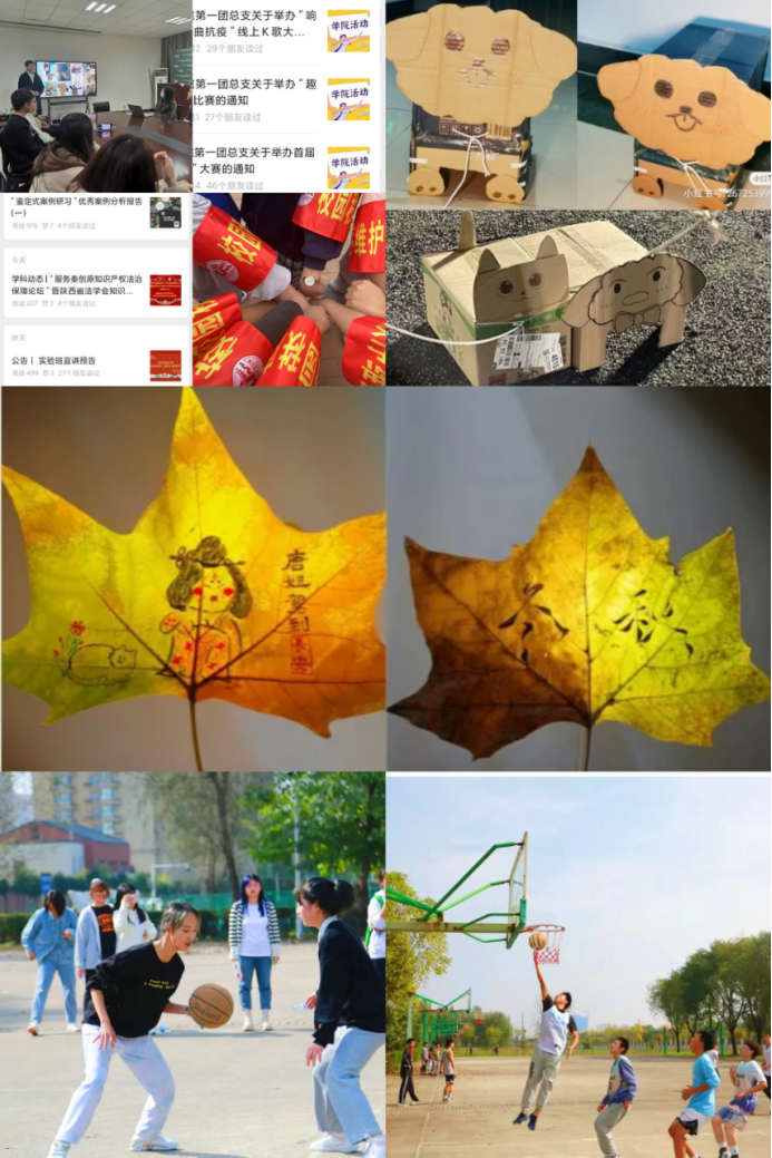 团委精心策划、积极筹备, 推出了例如“趣味五子棋”比赛、“响畅校园,金曲抗疫”线上K歌大赛、最美小宠物评选大赛 王者荣耀”电子竞技等活动,吸引同学的广泛参与。手工制作的环保小宠造型多样,惟妙惟肖。“这是我们宿舍一起做的纸盒小狗,它不仅有名字还有狗牌号”一位同学将他的爱宠放在宿舍门口“站岗”,自豪地讲解着小宠物的设计理念与制作过程;K歌大赛中,同学们积极参与,一展歌喉。一曲《致青春》唱出了美好的青葱岁月、《晴天》带我们走过寒冬,绽放美好……这样的活动不仅丰富了课余生活,也带来了封校期间心灵的慰藉,宿舍好友一起利用废弃纸箱,开动脑筋,动手制作,加强了宿舍成员的凝聚力。“王者荣耀”电子竞技赛的开展,加强了同学们的团队协作能力,促进了班级之间的沟通与交流。学生冠军队伍与成人直播