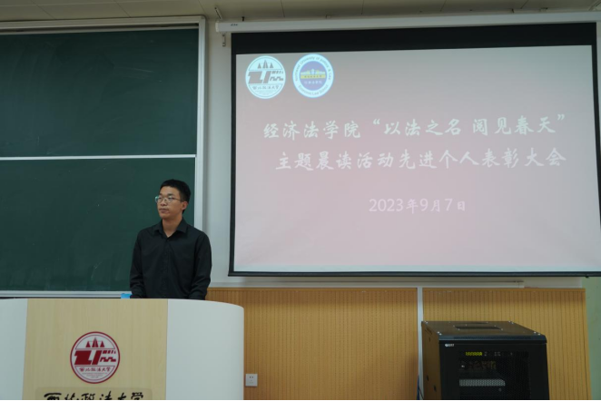 颁奖过后,胡熠凝和吴沁霓作为晨读先进个人代表进行发言。胡熠凝同学谈及通过晨读活动阅读的《法治的细节》与《圆圈正义》,增强了对法学知识的了解,坚定了成为一名捍卫公平正义的法律人的决心。吴沁霓同学强调通过此次晨读活动不仅从苏力教授的《法治及其本土资源》一书中攫取了知识与智慧,更深刻体会到晨读带来的利好,克服懒惰心理,保持规律的作息,以高效学习、积极进取。