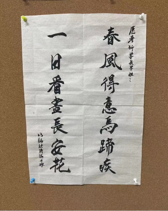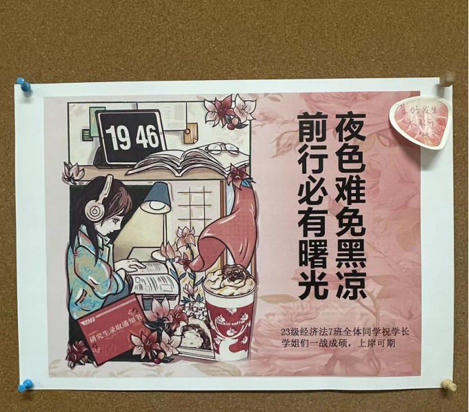 )2023级同学们在14号公寓“一站式”学生社区为即将参加考研的2020级学长学姐送上了一份特别的祝福,他们用心创作,将真挚的祝福融入其中,为学长学姐们加油打气,希望学长学姐们感受到来自学弟学妹们的关爱和鼓励。