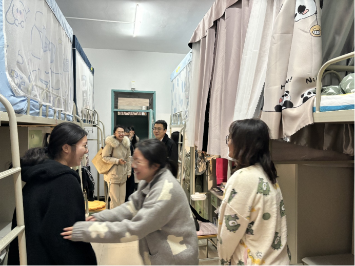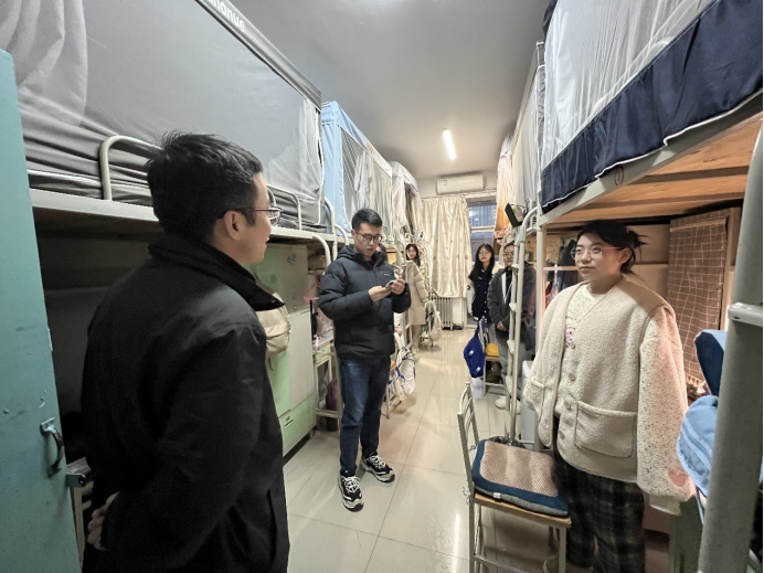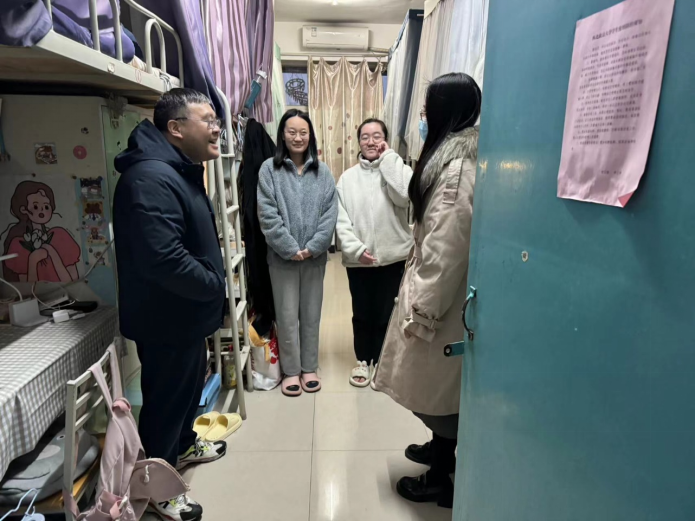党委副书记李恒,辅导员王文、李冬冬、张兴浩、吕悦、来沅晖、王可卓走访各级学生宿舍,与同学们面对面交流。