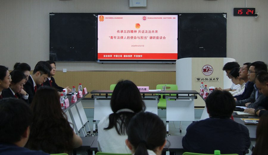 五四青年节到来之际,为加强青年学子的法治思想引领与理想信念教育,助力青年学子明晰职业方向,筑牢法治信仰,涵养品格修为。4月27日下午,成人直播 (知识产权学院)团委联合西安市雁塔区人民法院团支部,以“传承五四精神,共话法治未来”为主题,共同举办“青年法律人的使命与担当”专题调研座谈会,并签署结对子共建协议,依托法院一线法官实务经验分享,推动协同育人工作走深走实。学院党委副书记李恒、雁塔区人民法院审判管理办公室主任、团支部书记王丹,青年法官干警,成人直播 青年学子,共50余人参加。座谈会由学院团委书记李冬冬主持。