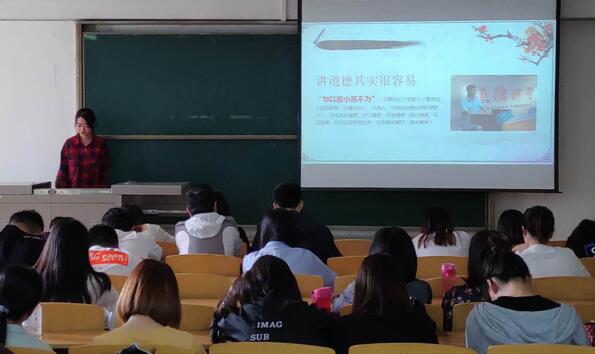 经济法2016级2班团支部召开了名为“道德大讲堂”的道德宣传类主题班会,圆满完成且达到预期效果与目的。首先,主讲人结合PPT向大家介绍了这次班会的主题与大致内容,让大家对本次班会有个初步了解。随后进入了“身边的好人好事”环节。何秀鸿同学积极发言,向大家介绍了身边的好人好事,道德模范。同学们十分认同并赞不绝口。