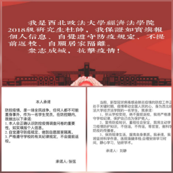 庚子新春,突如其来的新冠肺炎席卷全国,面对疫情,党中央统一指挥,全国人民众志成城。为深入学习贯彻习近平总书记关于新冠肺炎疫情防控工作重要讲话、重要指示批示精神,为把我校的各项工作部署落到实处,2020年2月18日,成人直播 2018级全体研究生在辅导员蔡奇轩老师的统筹协调下,针对当前的疫情发展情况,做出庄严承诺。