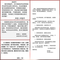 无论何种形式,同学们纷纷承诺不聚众,服从学校安排,不提前返校,并会按时、如实填写本人信息,对自己负责,对学校负责,对国家负责。做出承诺就多了份责任,面对疫情防控工作,我们责无旁贷!