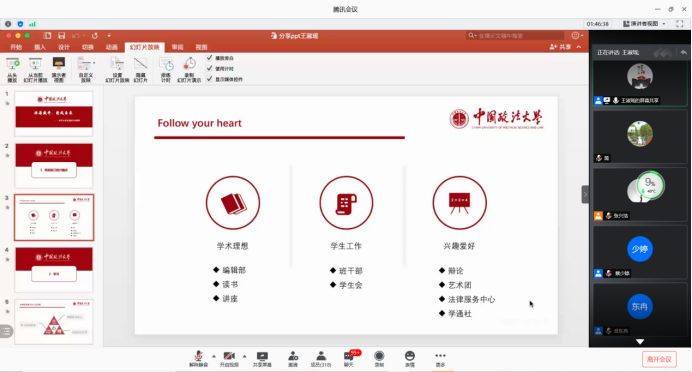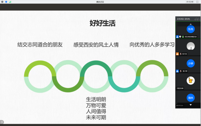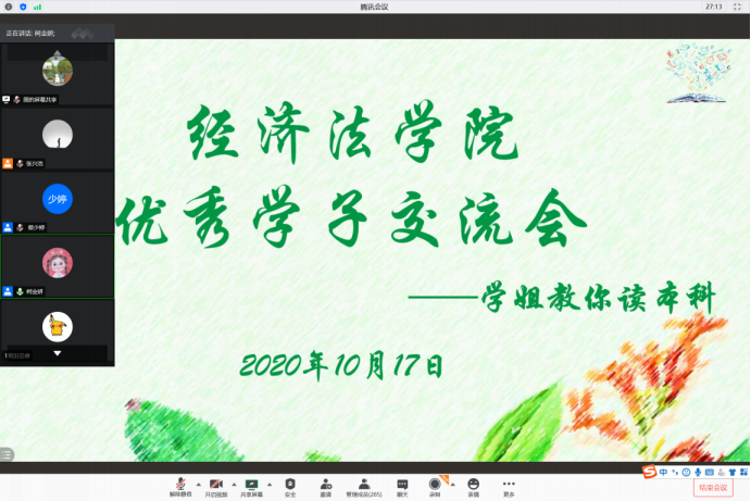 为帮助2020级新生对崭新的大学生活全面的了解和认识,尽快适应大学生活,加快转换角色,对未来大学生活进行全面规划。10月17日晚19:00,成人直播 在腾讯会议开展优秀学子线上交流会。成人直播2020届优秀毕业生岳东冉、柯金妍、王淑瑶、蔡少婷进行经验分享,全体2020级新生参加交流会,交流会由2020级辅导员张兴浩主持。