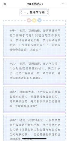 公众号以及短视频平台、院网宣传和课堂培训,以线上线下两种方式筑牢心理健康教育阵地。开展了“你好,树洞先生”——“WE经济法”匿名投稿答疑专栏、“与心灵相约,与健康同行”——公益广告作品征集活动、诚信主题舞动双手活动和优秀心理健康主题电影配音秀等活动,激发了学生的创造力,通过学生喜闻乐见的方式做好育人工作。同时,成人直播
