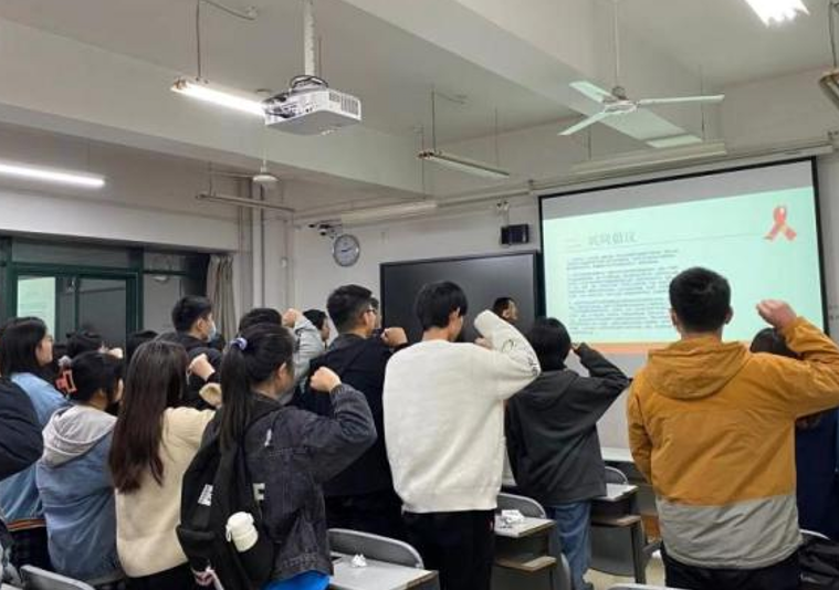 同时,学生志愿者们还举办知识竞赛、观看纪录片、拍摄防艾志愿照片等形式多样的活动。各班同学在志愿者的组织下,进行了防艾知识竞赛活动,以抢答形式增强大家对了解防艾知识的积极性,同时组织同学们观看艾滋病相关纪录片,深入学习艾滋病的发病原理、传播方式、预防方法等。最后,各班志愿者呼吁同学们在学校内的标志性建筑前佩戴红丝带合影,以实际行动带动身边的同学关注防艾行动。