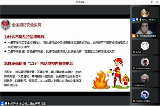 首先分享的是2019级研究生班长杨文静同学,她以消防基础知识、消防设施的介绍和应用为主要方面,向大家介绍灭火器的类型、区别和使用方法。以轻微火情如何应对、被火围困房间怎么办等内容为切入点,展开讲述在危险情况下如何自救。