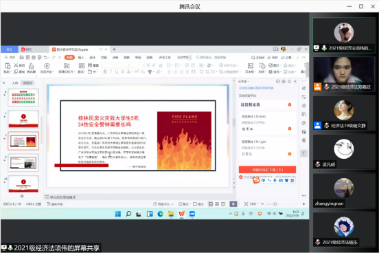 第二位分享的是2021级研究生生活委员项伟同学,项伟为大家分享了一些关于宿舍失火的惊险案例。通过案例警示我们:消防安全,重中之重,人人有责。