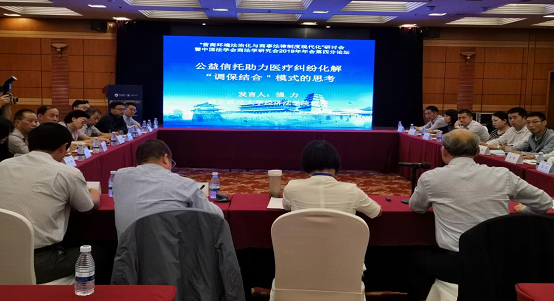 强力教授在学术辩论会与圆桌会议—金融制度创新专场就“公益信托助力医疗纠纷化解‘调保结合’模式”做主题发言。他认为根据‘调保结合’模式促进公益信托助力医疗纠纷的化解具有非常大的现实意义。首先,要学会正确界定商业组织调解的公益性与商业性;其次,要思考商业保险经纪的后续资金应该如何持续以保证健康持续运转、商业组织调解的公信力该如何保证等实际问题;最后,强力教授提出要设立公益信托,吸纳社会资金等一系列具体举措。