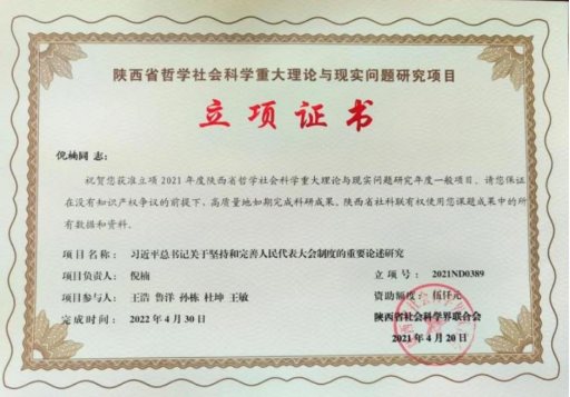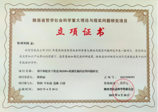 近日,陕西省社科界联合会发布了《陕西省哲学社会科学重大理论与现实问题研究项目2021年度一般项目立项名单》,成人直播2项课题立项,分别是陈娟丽老师申报的《碳中和愿景下推进REDD+机制实施的法律问题研究》和倪楠老师申报的《习近平总书记关于坚持和完善人民代表大会制度的重要论述研究》。