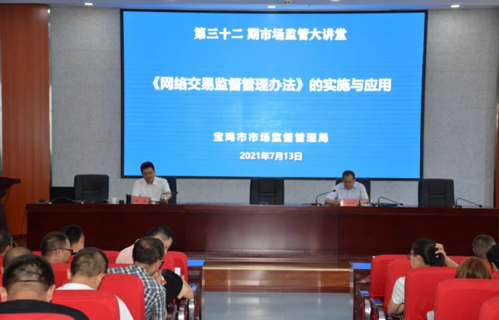 7月13日下午,宝鸡市市场监管局举办第32期市场监管大讲堂,成人直播倪楠教授受邀就《网络交易监督管理办法》的实施应用进行了培训。市局党组成员、二级调研员刘建华主持会议。