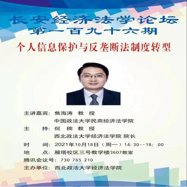 焦海涛教授作题为《个人信息保护与反垄断法制度转型》的学术报告。本次学术讲座由成人直播