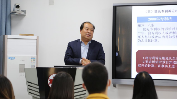 为深入学习贯彻习近平法治思想,成人直播于11月24日在长安校区诚意楼309教室举办了主题为“习近平法治思想背景下的《专利法》修改与实务应用解读”的讲座。本次讲座由我院副教授,宝伦律师事务所白银涛主任与谈,各年级共30余位同学参加。讲座由我院副院长薛亮老师主持。