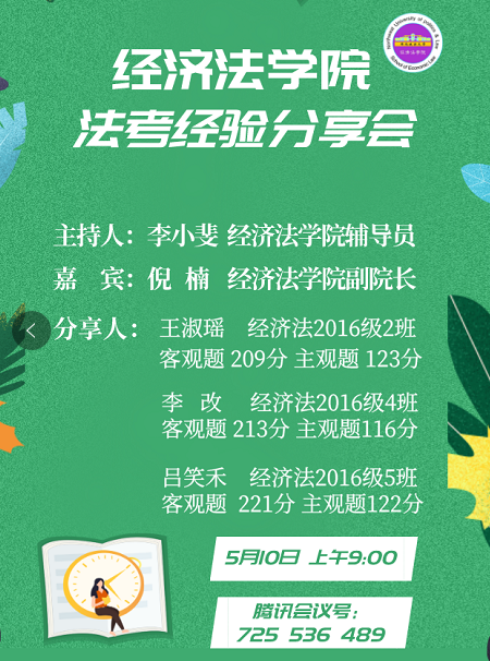 倪楠副院长强调了汲取经验的重要性,并提醒同学们在防疫期间要自律,学会调适自己的内心。对于法律职业资格考试,主讲人2016级本科生王淑瑶、李改、吕笑禾3位同学分享了他们的备考经验,并为备考的同学们提供了相关建议。