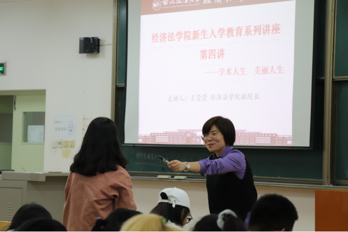 王莹莹首先强调了课堂的重要性,告诫同学不要旷课,要勤奋学习,坚持理想。在处理大学生活中的人际关系时,她建议同学们培养高情商,建立良好的师生关系与同学关系;课堂之外,要“读万卷书,行万里路”,丰富文化修养,增强综合素质,在政治、历史、哲学等其它各个方面都需有所涉猎。王莹莹最后与同学们分享了自己总结的学习经验,并将外语和财经比作学习工作的两个翅膀,阐述了二者的联系与作用。