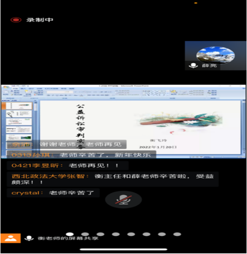 薛亮副院长总结认为,成人直播本期实务大讲堂是继2021年秋季学期以检察官视角探讨公益诉讼后,再一次从法官视角对公益诉讼制度的解读,这种系列化的主题讲座有助于同学们将相关知识的学习推向纵深。他感谢衡飞玲主任在大寒节气在云端带来两个小时的精彩讲授,也感谢衡主任长期以来对成人直播实践教学工作的大力支持,并邀请衡主任在合适的时机再次莅临我校为师生们带来更加精彩的讲座。讲座结束时,同学们纷纷通过线上交流表达了对于两位老师的感谢,同时也希望能有更多机会与实务专家沟通交流,通过不同路径学习法律知识,不断提升自身综合素质。