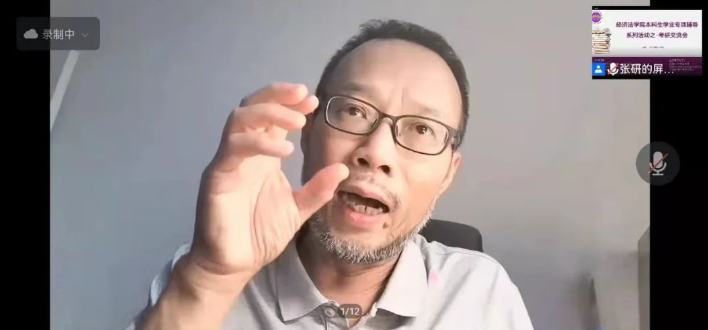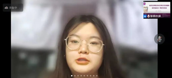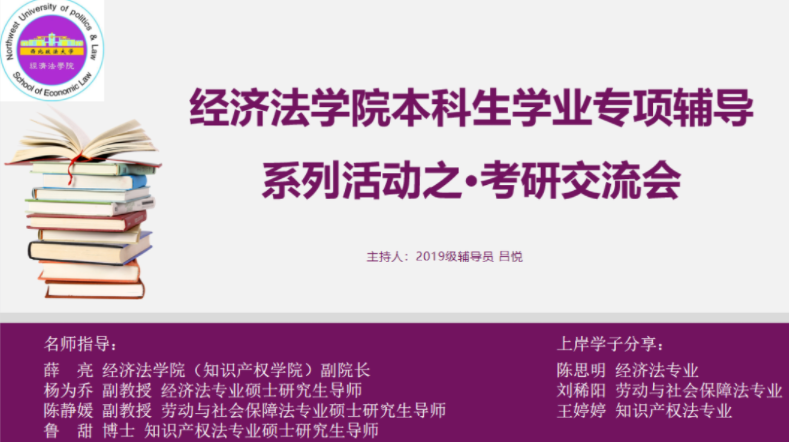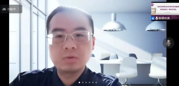 会议由2019级辅导员吕悦老师担任主持人,成人直播副院长薛亮副教授、经济法专业硕士研究生导师杨为乔副教授、劳动与社会保障法专业硕士研究生导师陈静媛副教授与知识产权法专业硕士研究生鲁甜博士在线辅导。会议同时邀请了三位考研上岸同学进行经验分享。2019级近百位本科生参加了本次会议。