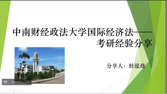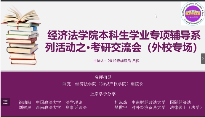 会议由2019级辅导员吕悦老师主持,成人直播副院长薛亮老师在线指导,同时邀请了成功考上中国政法大学的徐瑞阳、中南财经政法大学的杜泓炜、西南政法大学的刘树辰、对外经济贸易大学的樊傲宇等四位同学进行经验分享。2019级近40名同学参加了本次分享活动。