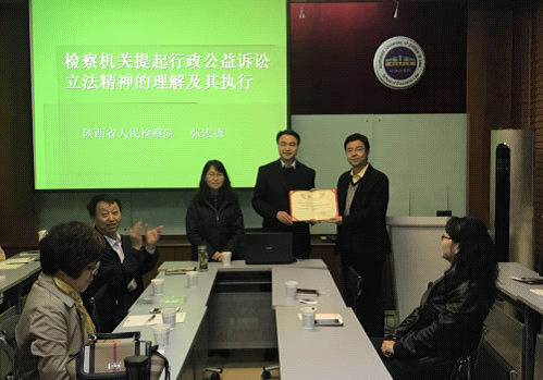 张宏德处长从行政公益诉讼的改革背景、立法规定及精神、审查案件中的运用、检察工作中的运用以及陕西情况等五个方面,对检察机关提起行政公益诉讼的工作现状进行了详细阐述。他指出,自党的十八大提出五位一体总格局,将生态文明建设纳入国家总体建设格局以来,检察机关提起行政公益诉讼这一机制就拥有了鲜明的时代背景。继而通过中央决策、人大授权和高检部署这一系列实践,逐渐形成了全国检察机关开展行政公益诉讼改革试点的基本框架,而在经历两年多的试点实践后,全国人大常委会于今年6月正式通过决议,修改《民事诉讼法》和《行政诉讼法》两部法律,正式将检察机关提起公益诉讼制度写进法律。截止2017年6月底,全国线索数11226件,建议数7903件,起诉1150件,并且日后还有逐渐扩大的趋势。在讲述过程中,张宏德处长勉励广大环境与资源专业的学生们积极投身公益诉讼相关实践,并寻求检察机关同高校建立合作机制等。
