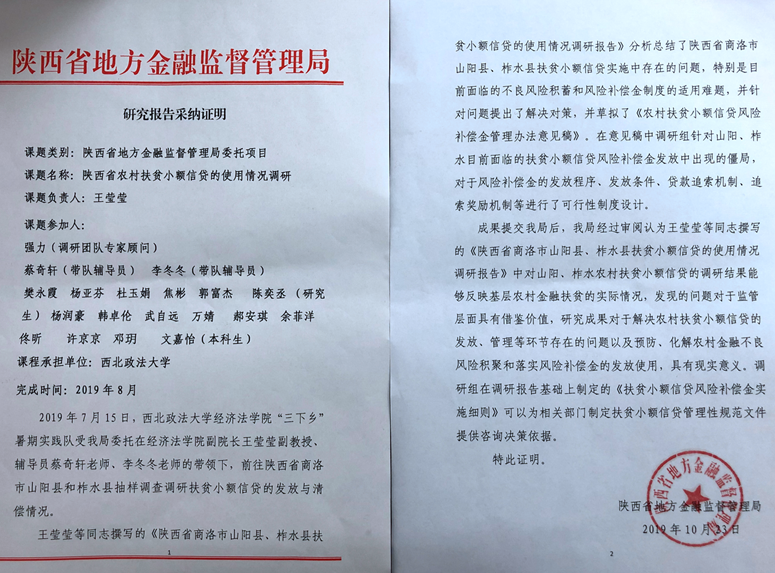 近日,陕西省地方金融监督管理局向成人直播 “三下乡”暑期社会实践队发来《陕西省商洛市山阳县、柞水县扶贫小额信贷适用情况调研报告》采纳证明,在调研报告基础上草拟的《农村扶贫小额信贷风险补偿金管理办法意见稿》与《扶贫小额信贷风险补偿实施细则》也为相关部门制定扶贫小额信贷管理性规范文件提供了咨询决策依据,调研实践得到了相关部门的高度肯定。