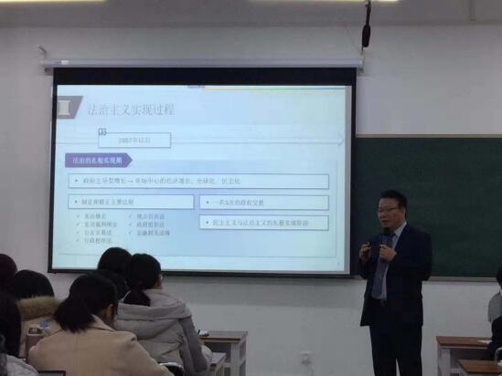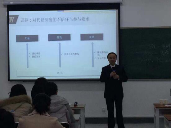 李益铉院长从包括韩国法律概要、比较法看韩国法律等六个方面讲解韩国法治主义的发展。在韩国法律概要这一部分中,李益铉院长向同学们简要介绍了韩国法律所属法系、韩国法律的渊源以及韩国的立法程序。李益铉院长指出韩国法为大陆法系,是经过日本引进德国法制的。韩国法以成文法为中心,否认判例的法源地位。从法源讲,宪法作为国家的基本法,具有最高地位。韩国宪法认为,除了国会制定的法律意外,还将总统令、总理令及各政府部门的部令认定为法律规范。宪法还认为,根据宪法签署的条约具有与法律同等的效力。此外,还有行政规则、地方自治团体的条例与规则。在对韩国法律做了简单介绍后,李益铉院长从比较法的角度通过和德国、美国的比较向同学们讲解了韩国的立法、执法和司法。李益铉院长指出,韩国实行三权分立,根据宪法立法权属于国会,但事实上是与政府共享的;政府部门对于法律具有解释权;法院是法律纠纷解决的基本机构也是最终机构。在第三部分中,李益铉院长以画时间轴的方式清晰的向我们介绍了韩国法治主义的实现过程。韩国的法治主义实现大致可以分为三个阶段,第一个阶段是引进期,大致从政府建立至1950年代;第二个阶段是高度增长期,从1960年代至1980年代;第三个阶段是1987年以后,是法治扎根实现期。这三个阶段各有其特点以及形成这些特点的原因。在讲座的最后部分,李益铉院长与同学们讨论了关于韩国法治发展前沿的三个课题,包括韩国民众对代议制度的不满与要求政治参与、国内政治两极分化严重以及科技发展对法治的影响。