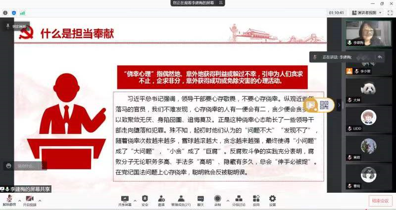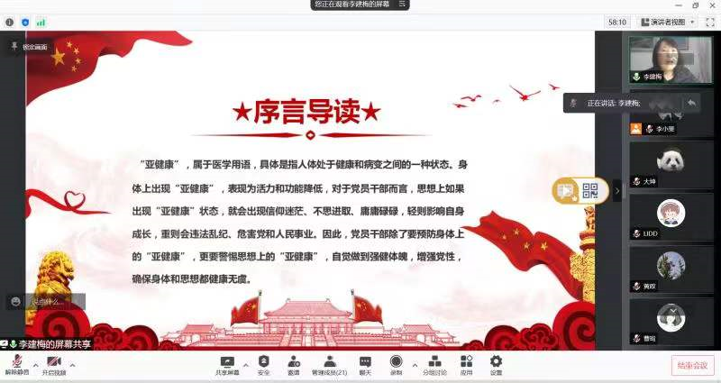 的疫情防控工作、学生管理、线上教学工作、宣传工作以及支部政治理论学习工作进行了细致安排部署。她表示,当前防控形势下要时刻绷紧疫情防控这根弦,高度重视,强化管理,做好两校区及校外教职工、家属及租住户、学生等各项数据排查统计工作,做好在校大学生管理工作,发挥党支部战斗堡垒作用和党员先锋模范作用。李建梅还肯定了成人直播