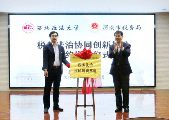 与渭南市税务局在渭南市富平县举行“税务法治协同创新基地”签约揭牌仪式。渭南市委常委、富平县委书记赵林斌,陕西省税务局党委委员、纪检组长王宏伟,渭南市税务局党委书记、局长刘玮,我校党委委员、副校长张荣刚、成人直播
