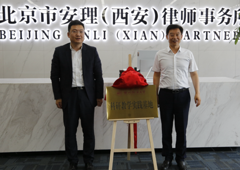 院长倪楠与北京安理律师事务所西安办公室主任屈金冈共同为科研教学实践基地揭牌。