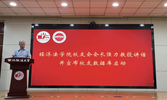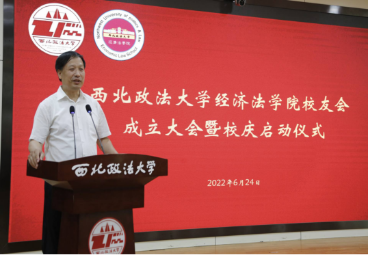 )校友会会长强力教授发表当聘感言。他首先向与会的嘉宾、校友以及参与筹备工作的同仁们表达了感谢之情。他表示,在西安的校友,虽然年龄不同、专业各异、工作有别,但是西法大经济法校友的身份将我们紧密联系在一起。他将与理事会成员一起,秉承服务校友、服务母校、服务全国的宗旨,充分发挥社会团体的优势,依法依规开展丰富多样的校友活动,更好地服务社会经济、服务地方发展。同时,宣布启用了经济法校友数据库。