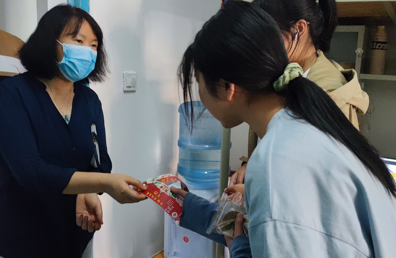 精心准备的中秋午餐券,并与大家进行了亲切交谈,了解了刚入学新生们的适应情况,倾听他们的困难和疑虑,详细询问了同学们的学习生活情况,叮嘱同学们做好防护、认真落实疫情防控要求,坚持“非必要不离校”,勉励同学们珍惜大学时光,以更加饱满的精神面貌投入到大学的学习生活中去。