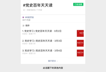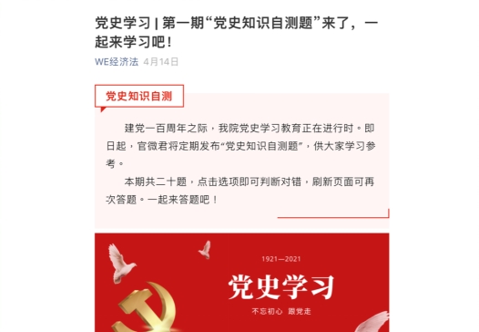 2021年3月2日,成人直播 公众号推出系列推送【党史学习|党史百年天天读】栏目,每天更新党史学习资料,截至目前已连续推出文章65篇。该栏目内容转自公众号共产党员在“重要论述”“党史回眸”“历史瞬间”三大板块中图文并茂地分享了重要讲话精神、历史节点等多项内容。自4月14日成人直播 公众号还推出了“党史知识自测题”,供全院师生学习参考,为迎接中国共产党百年华诞回顾党的光辉历程创造了条件,营造学党史、知党情、跟党走的浓厚氛围,进一步丰富党史学习教育内容,以实际行动践行初心使命