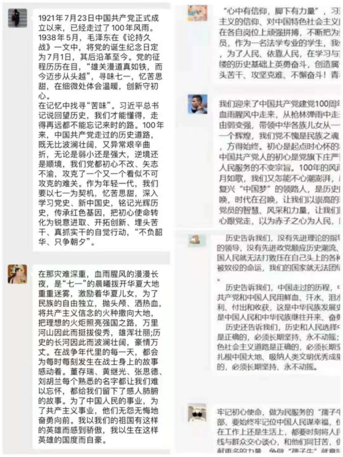 7月1日,成人直播 本科生第四党支部组织全体成员观看庆祝中国共产党成立100周年庆祝大会直播。7月4日下午,成人直播 本科生第四党支部开展习近平总书记在庆祝中国共产党成立一百周年大会讲话的线上交流学习会议。会议由支部书记吕莎主持,王雨婷、魏静、公安、陈弘彧、张爱琳、张瑶等同志积极参加,并在会上发表了自己的心得体会。